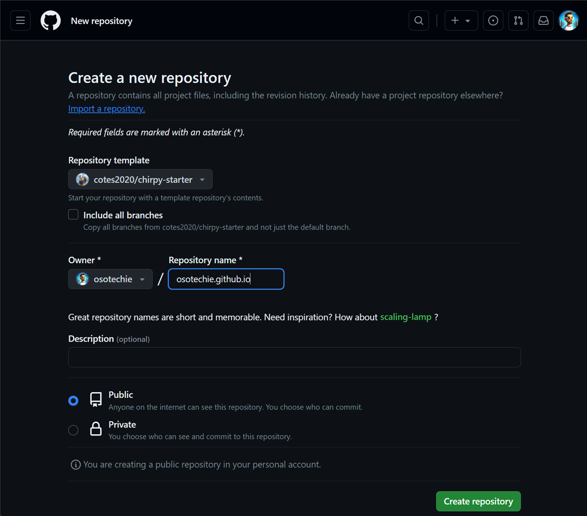 We will set the access permissions to Public as we are going to hose our site using GitHub Pages.