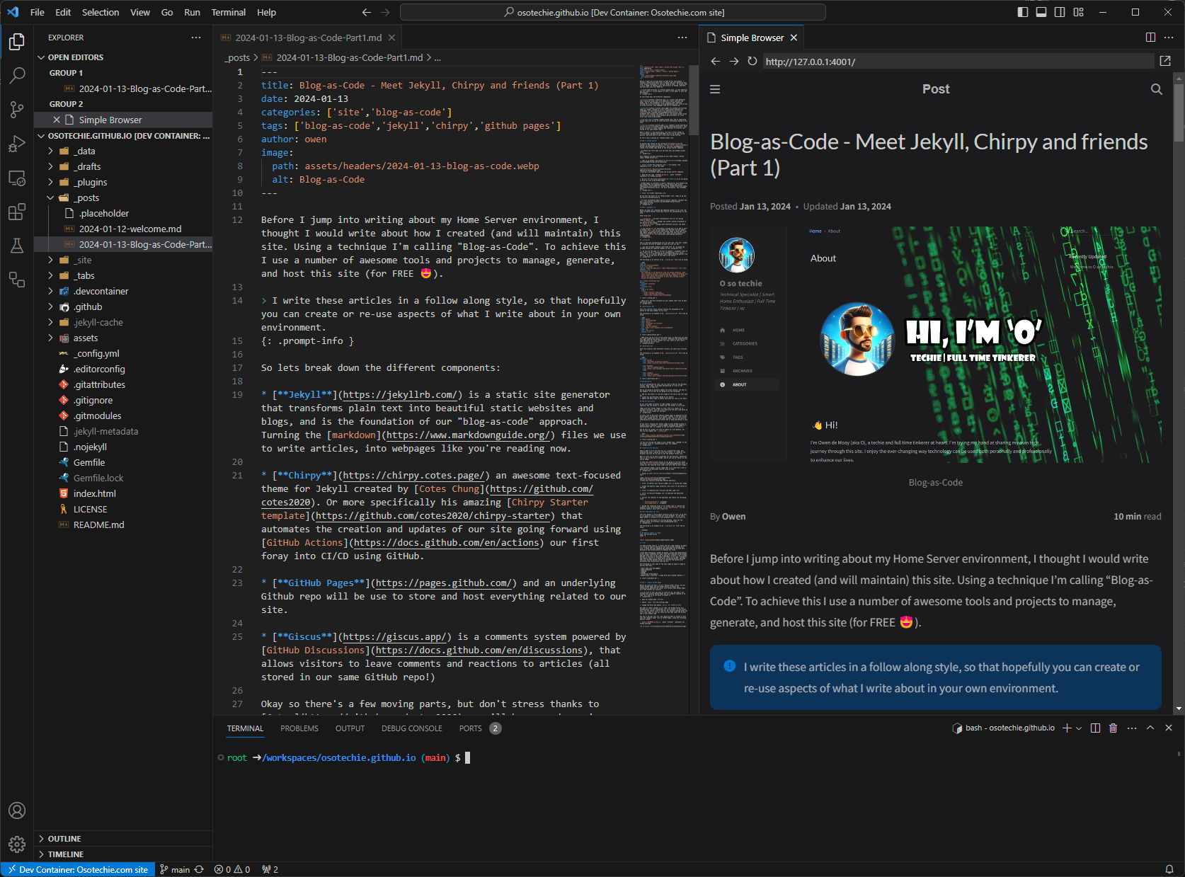 Well, it all came about after tinkering with Jekyll and trying different content management methods (especially dealing with draft posts, as they sometimes take several days to complete😁) and realising that I really need to spin up a development environment with everything so I can preview posts locally.