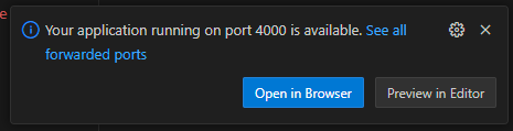 Once the container has started you should receive a notification in the lower right to open a preview of our site. I typically select Preview in Editor as it allows me to have the site preview, side by side with the aritcle I am working on.