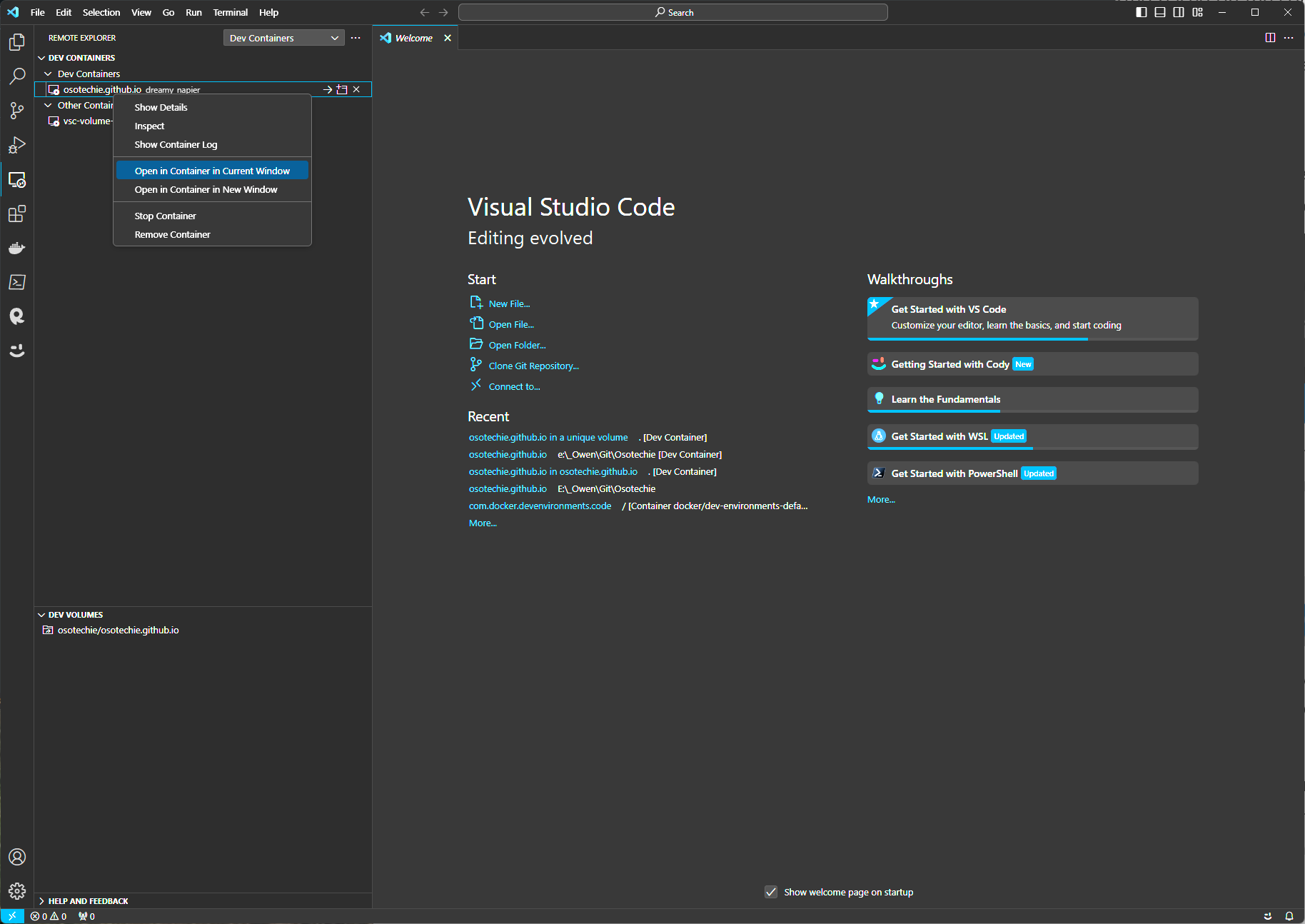 Dev Containers: Clone Repository in Container Volume...command, VSCode will re-open the existing container / volume, instead of creating a new oneUse the Remote Explorer to Open the Dev Container